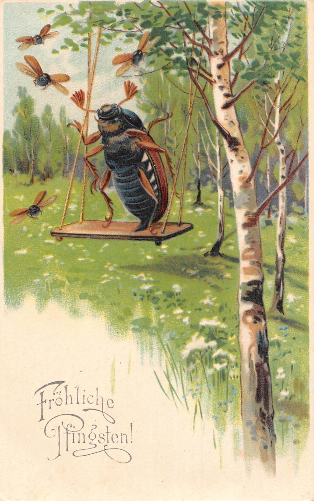 Pentecost Greetings Humanized Maybug on Swing Birch Tree postcard C317 This item is listed via xdm.it software