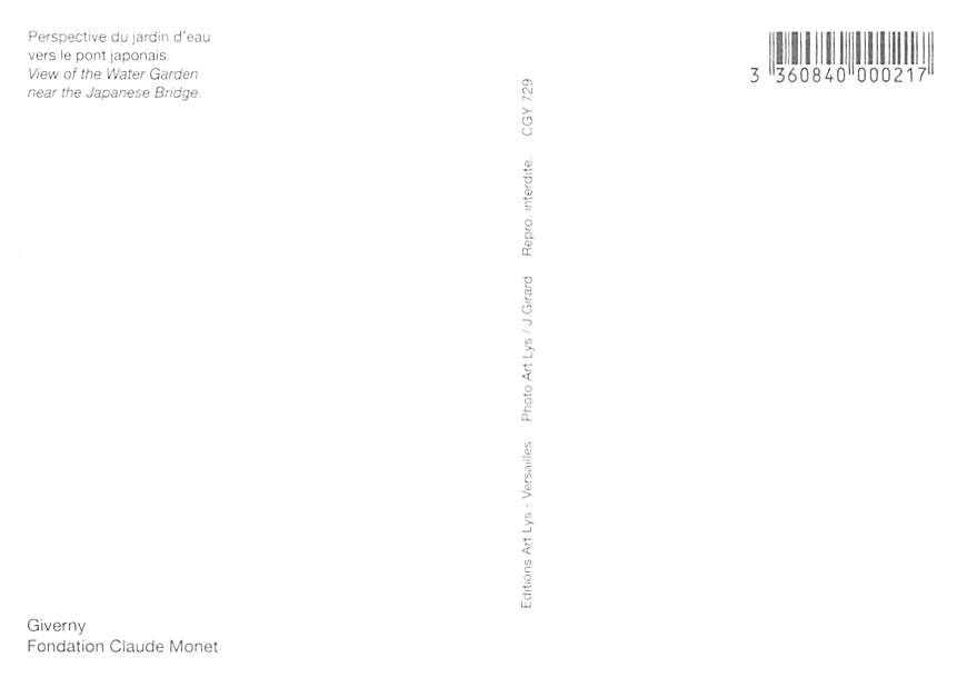 Perspective du Jardin d'eau - Claude Monet Grade: 1 Category: Continental Size Postcard, Approx 4 in x 6 in (10 cm x 15.25 cm) Product Size: Continental size: 4X6 inches (10.5 cm x 15 cm) Grading Scale: Grade ... Read More