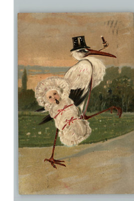 PFB BIRTH ANNOUNCEMENT Stork w Baby c1910 EMB PC