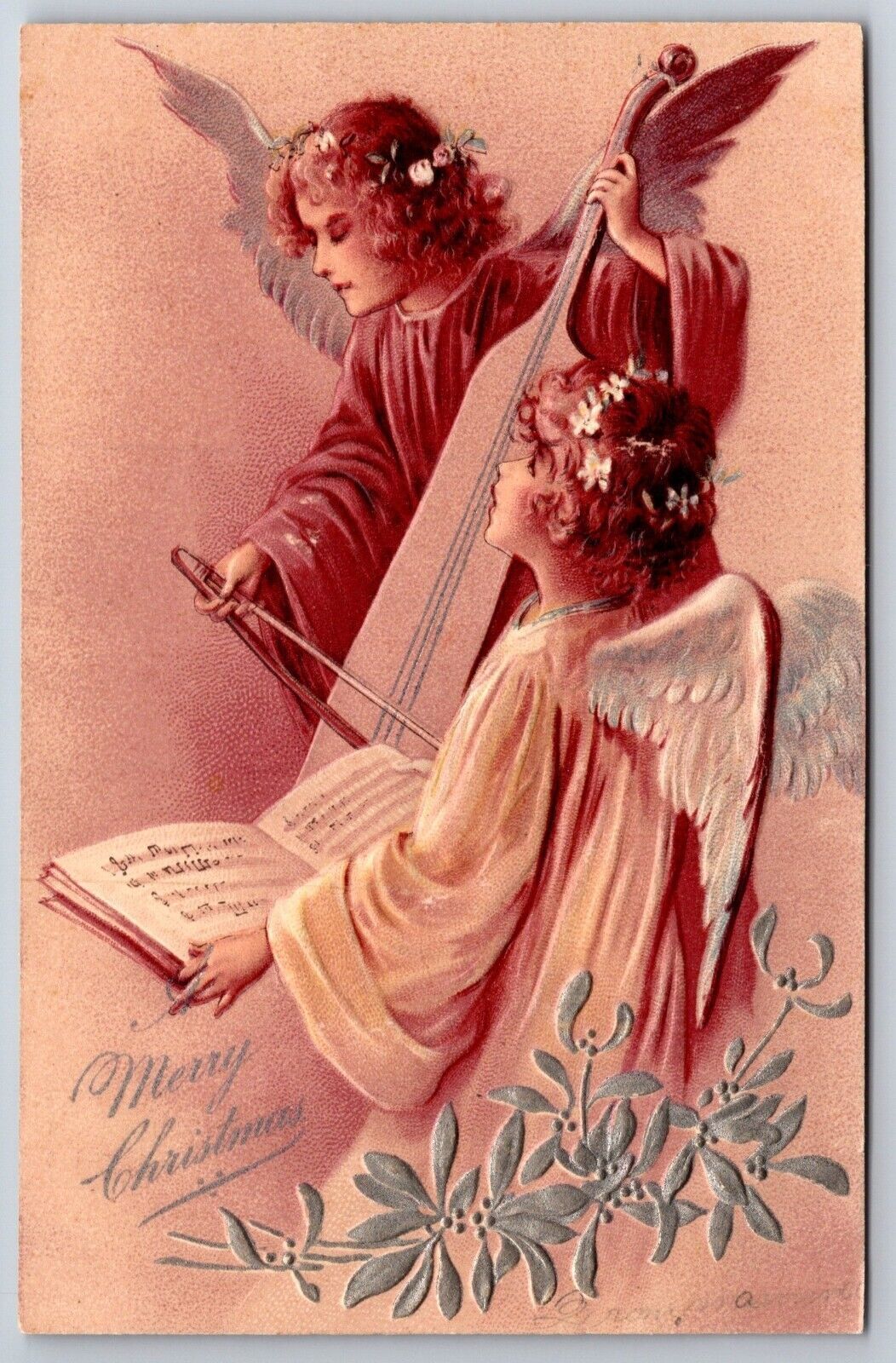 PFB Christmas~Angel Sings While Another Plays Cello~Silver Emb Mistletoe~#6372