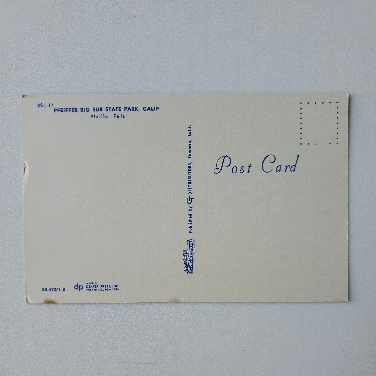Vintage Divided Back Chrome Postcard Featuring the Pfeiffer Falls at Big Sur State Park Located in Big Sur California. See photos for measurements.May show signs of vintage age including staining, rough edges, discoloration.Closely review photos for overall detailed condition.Postcard Shipping OptionsUSPS First Class - sandwiched in cardboard, better protection, door to door trackingUSPS Envelope - in poly sleeve, less protection, post office to post office tracking only.See other unique items at Sellz-It.We believe in reducing reusing recycling.
