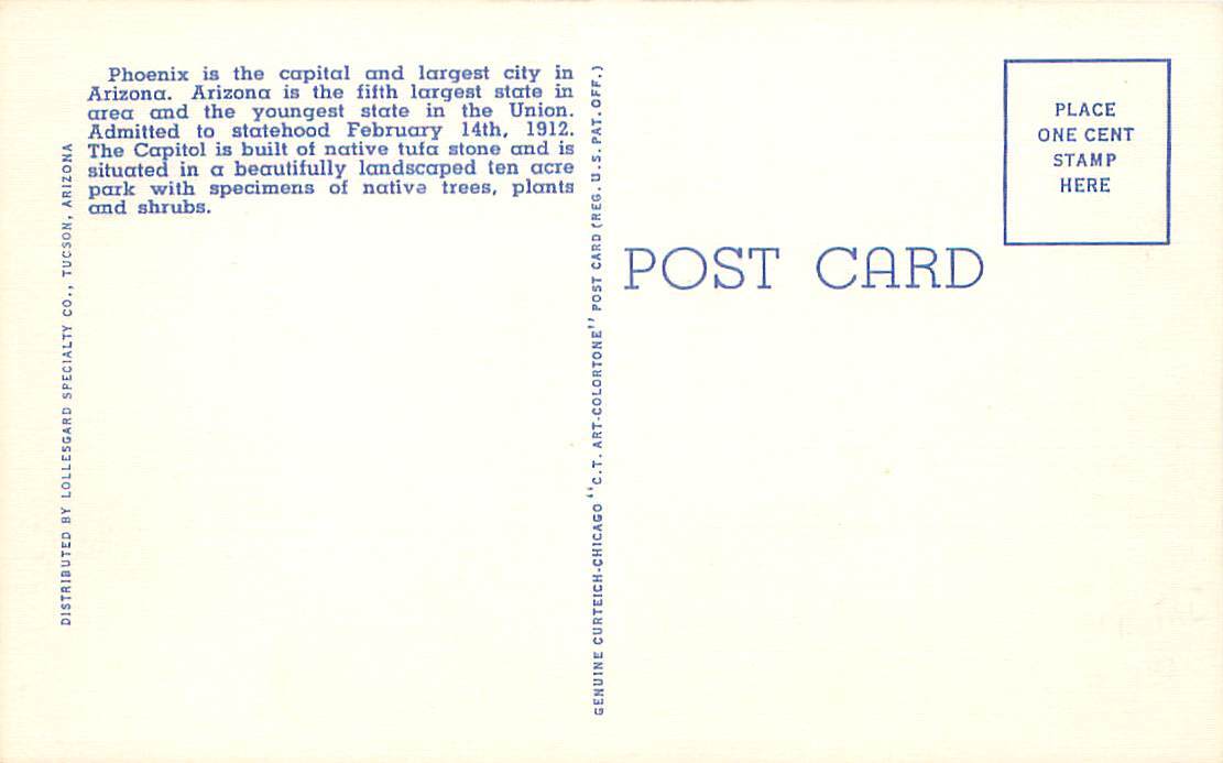 Phoenix Arizona State Capitol Building 1930s Linen Postcard Publisher: Curteich. Condition: No major flaws.