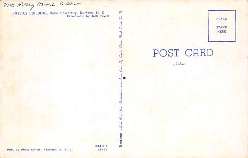 Physics Building, Duke University Durham, North Carolina NC Postcard - Unused Grade: 3 small hole in card Size: R - Regular Size Postcard - approximately 3 1/2 inch x 5 1/2 inch (9 CM x 14 CM) Grading Scale: Gr ... Read More