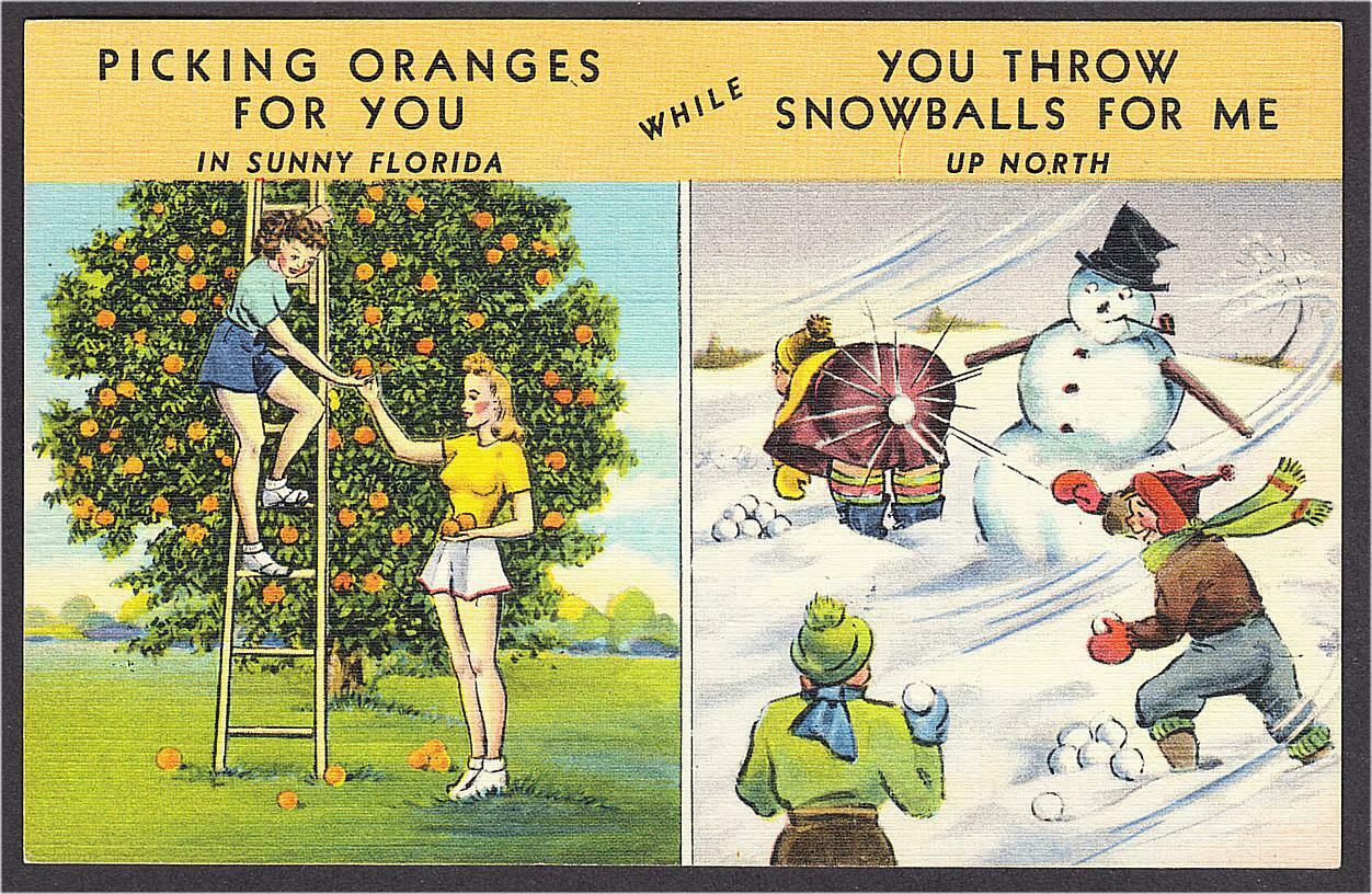Pick Oranges in Florida vs Throw Snowballs Winter Linen Comic Postcard 1940s #2