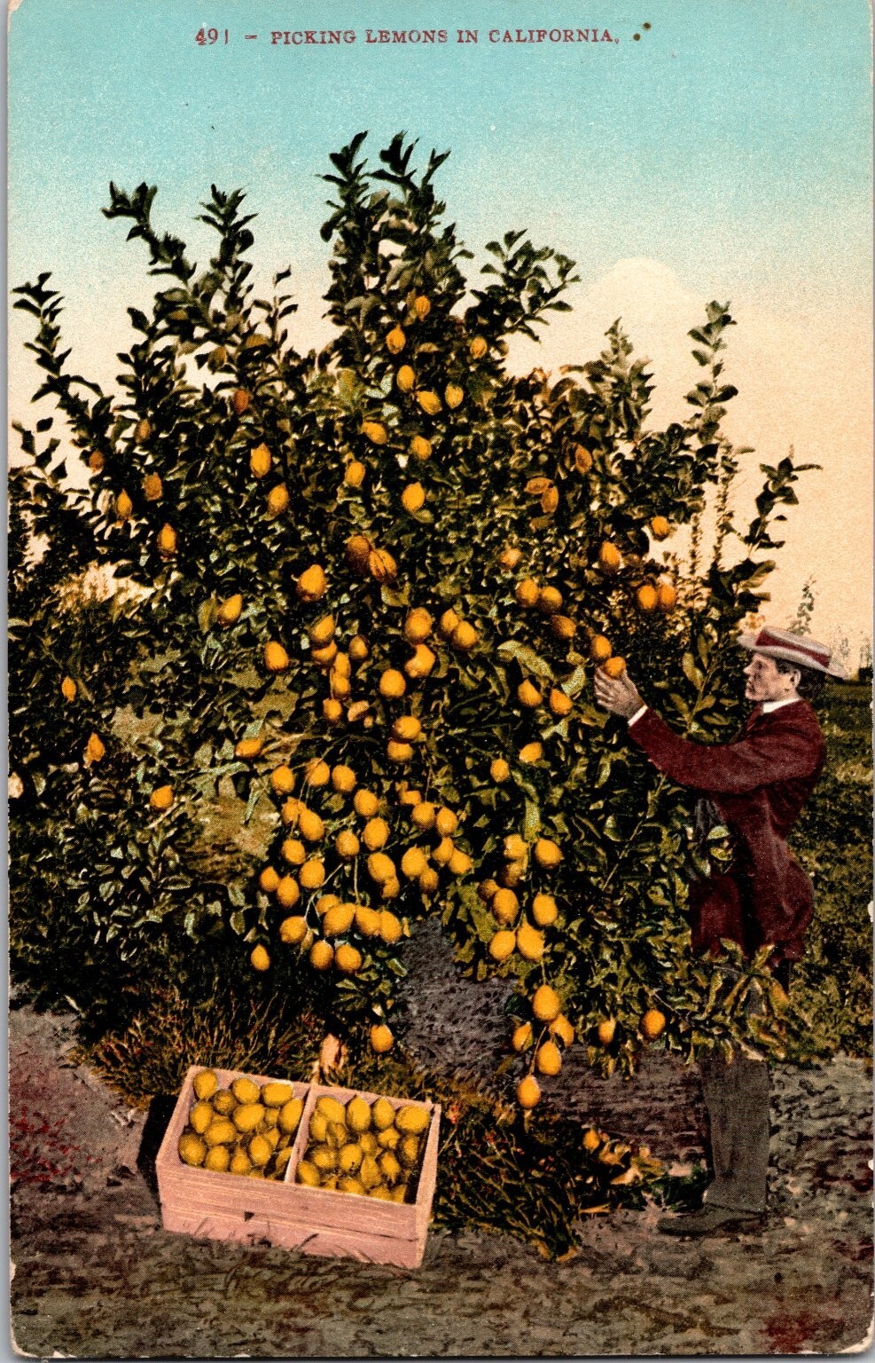 Discover a charming piece of California history with this vintage postcard, depicting a man diligently picking lemons from a bountiful orchard. The vibrant image captures the essence of early 20th-century agriculture in the Golden State, showcasing a classic scene of a full lemon tree laden with ripe fruit, alongside a wooden crate brimming with freshly harvested lemons.Published by Eow. H. Mitchell of San Francisco, California, this postcard is a testament to the era's printing techniques, likely featuring a colorized photographic image that brings the scene to life. It offers a glimpse into the state's significant citrus industry and agricultural heritage, making it a wonderful collectible for enthusiasts of California history, vintage postcards, or agricultural Americana.