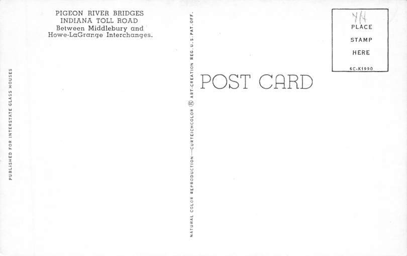 Pigeon River Bridge Pigeon Bridge, Indiana IN Postcard - View Images Grade: 1 Size: R - Regular Size Postcard - approximately 3 1/2 inch x 5 1/2 inch (9 CM x 14 CM) Grading Scale: Grade 1 = Perfect corners Grad ... Read More