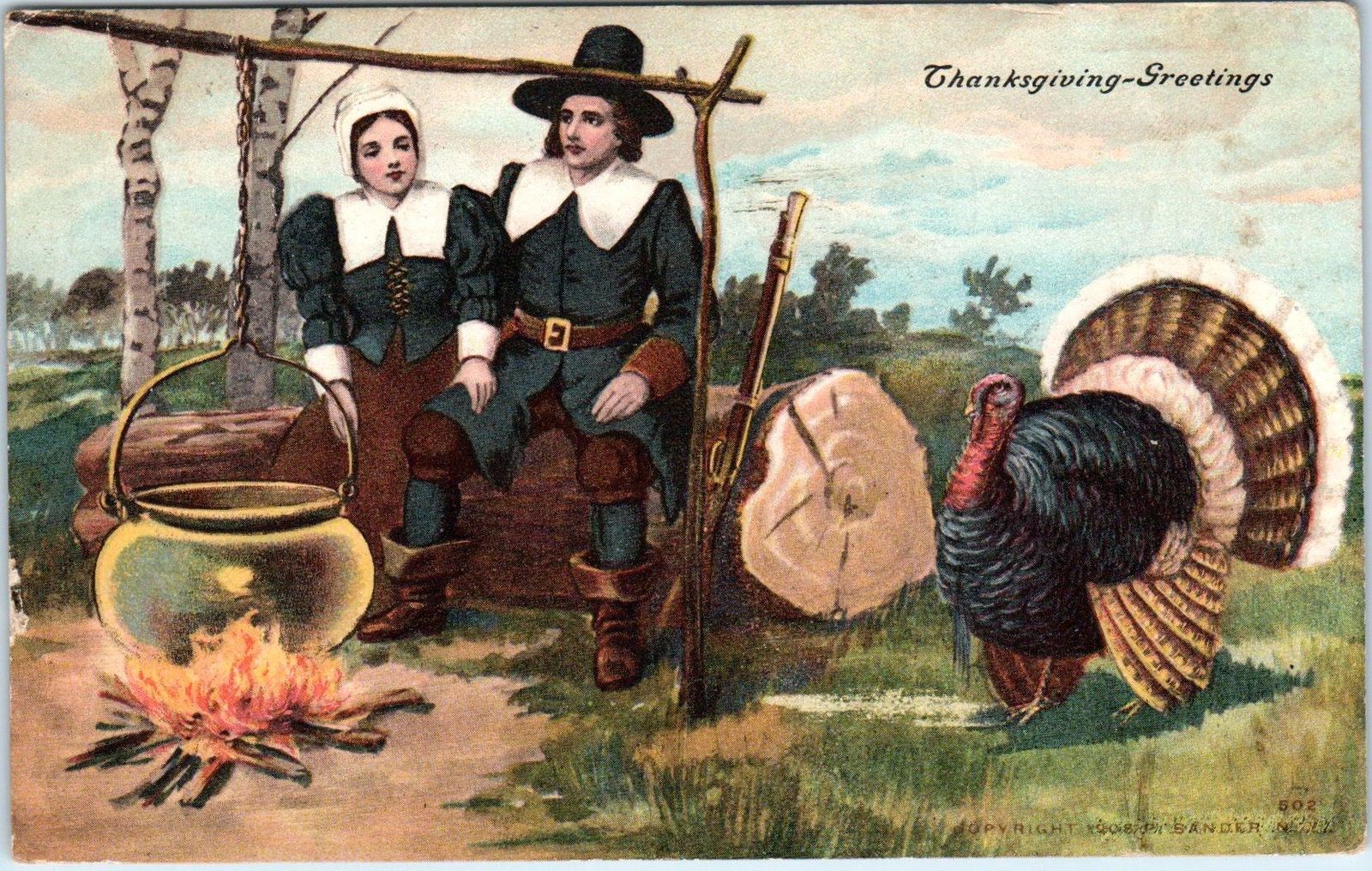 PILGRIMS & TURKEY, CAMPFIRE Thanksgiving 1908 Postcard