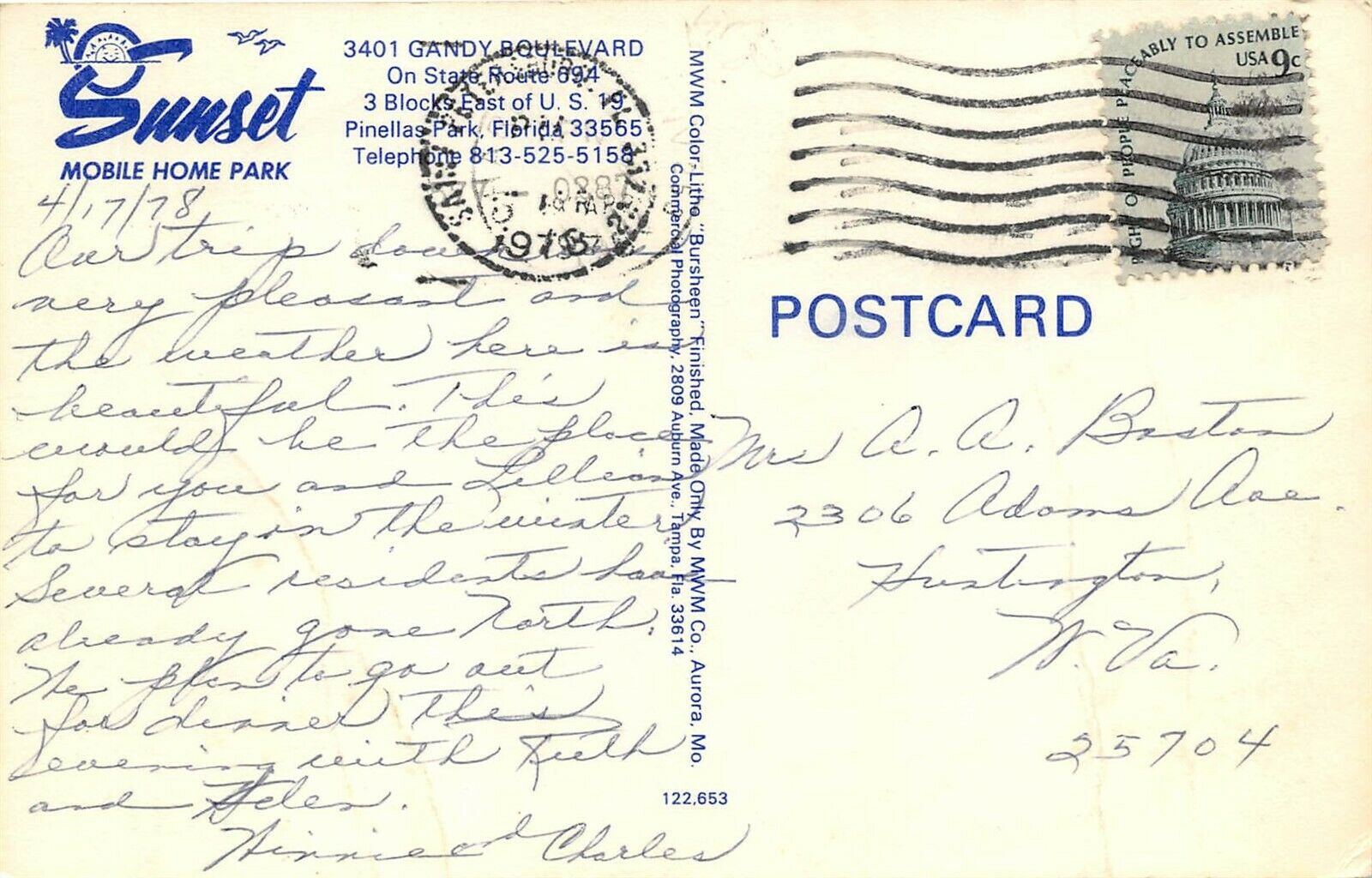 Pinellas Park Florida 1978 Postcard Sunset Mobile Home Park ... . Hip may add a marketplace facilitator (sales tax) depending on your location. If purchasing multiple items wait for a combined invoice before paying. Powered by SixBit's eCommerce Solution