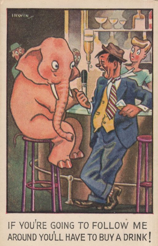 zx297 A vintage pink elephant pub humour postcard from circa the 1940s unused and lightly aged but just to its reverse only, this is absolutely great unused condition. The pink elephant wants buying drinks if the man thinks she's a lady and keeps chatting her up !!