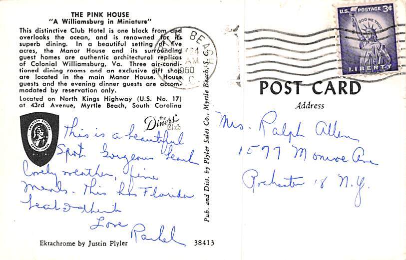 Pink House Myrtle Beach, South Carolina Postcard - 1960 Grade: 1 Size: R - Regular size: Approx 3 1/2 X 5 1/2 inch (9 cm X 14 cm) Grading Scale: Grade 1 = Perfect corners Grade 2 = Very Minimal corner wear, no ... Read More