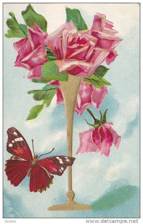 Pink roses, butterly, 00-10s :: Antique Postcard, 3.5" by 5.5", Litho, EX