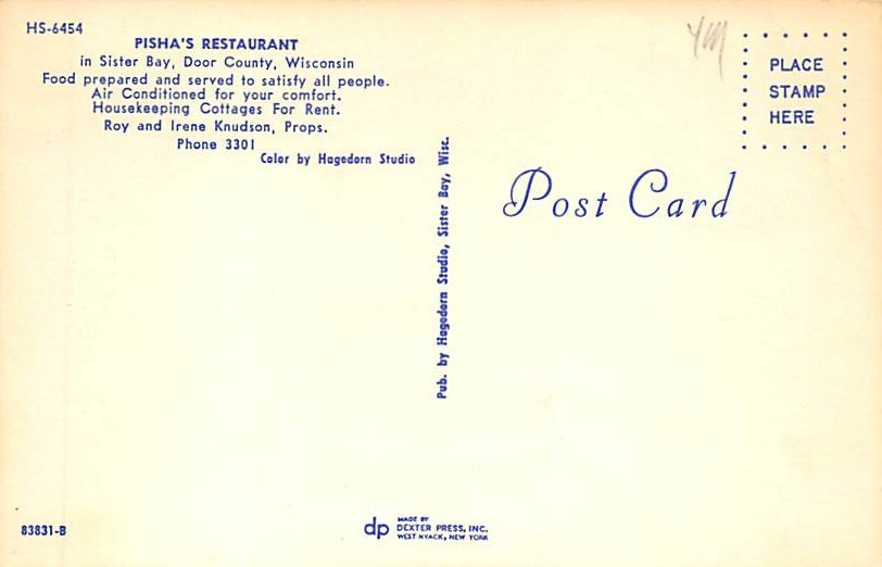 Pisha's Restaurant - Door County, Wisconsin WI Postcard - View Images Grade: 4 Size: R - Regular Size Postcard - approximately 3 1/2 inch x 5 1/2 inch (9 CM x 14 CM) Grading Scale: Grade 1 = Perfect corners Gra ... Read More