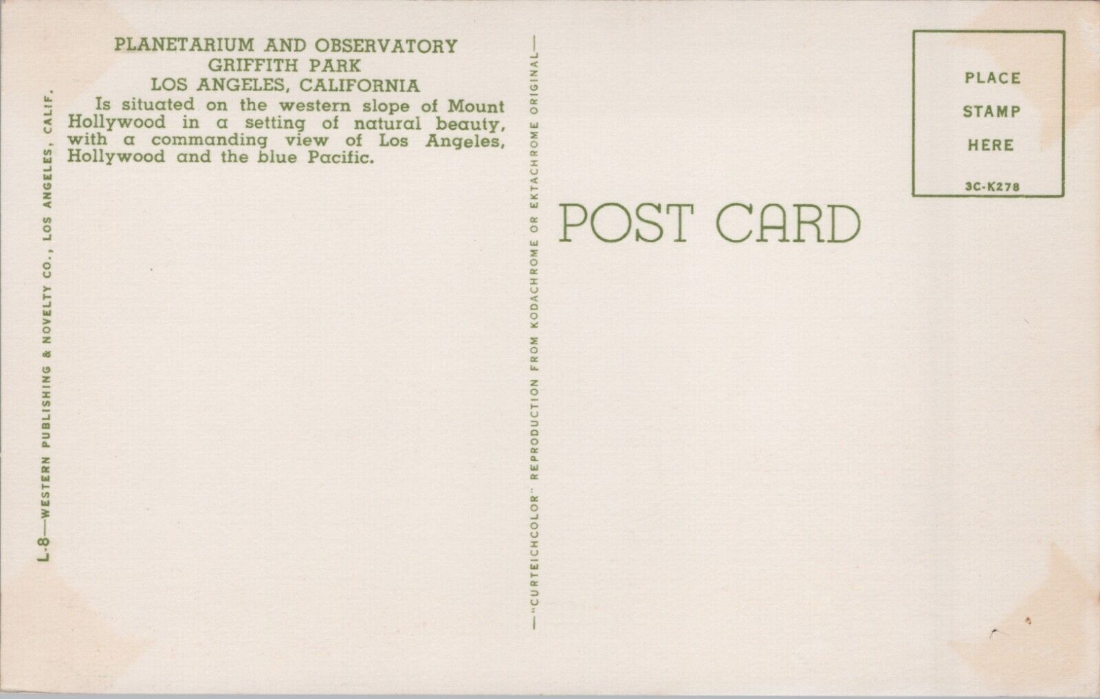 Condition: Look at the pictures for quality. The lines are from the scanner. Explore the wonders of the universe with this stunning postcard featuring the Griffith Park Planetarium and Observatory in Los Angeles, ... Read More