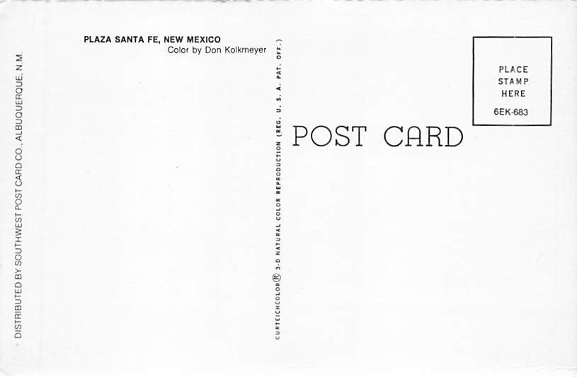 Plaza Santa Fe, New Mexico NM Postcard - Unused Grade: 1 Size: R - Regular Size Postcard - approximately 3 1/2 inch x 5 1/2 inch (9 CM x 14 CM) Grading Scale: Grade 1 = Perfect corners Grade 2 = Very Minimal co ... Read More