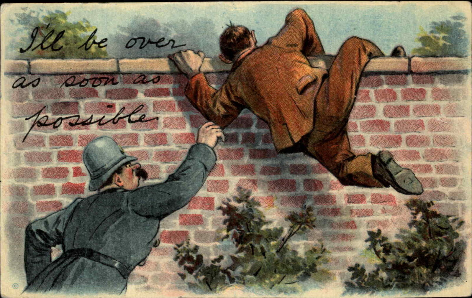 Police Officer Cop Chases Man Over Wall c1910 Postcard
