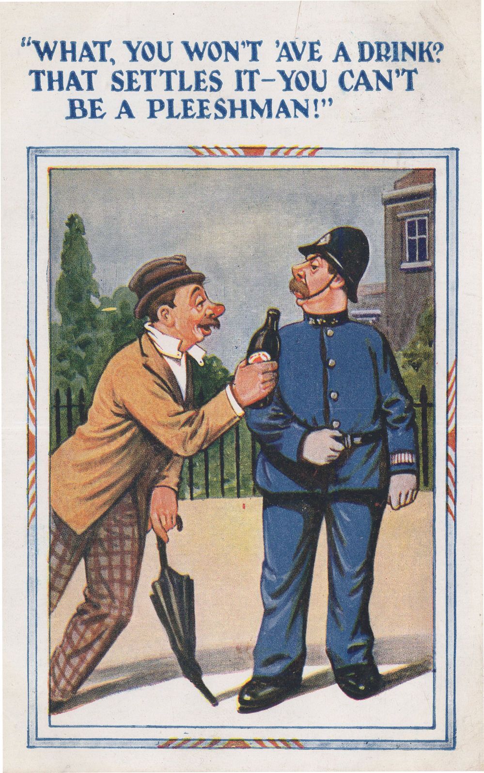 bg650 This has come from one of the most specialist collection of comic postcards this being an old drunken man trying to get a policeman to drink his old bottle of real ale and the officer refusing - the man accuses him of not being a true policeman if he wont get drunk with him - its 1930s dated used but very good and mostly great condition - the police officers uniform is very early 1900s;