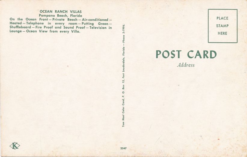 Pompano Beach, Florida - Ocean Ranch Villas Interior. Standard sized chrome card. Good to very good condition - Some foxing or other storage issue.