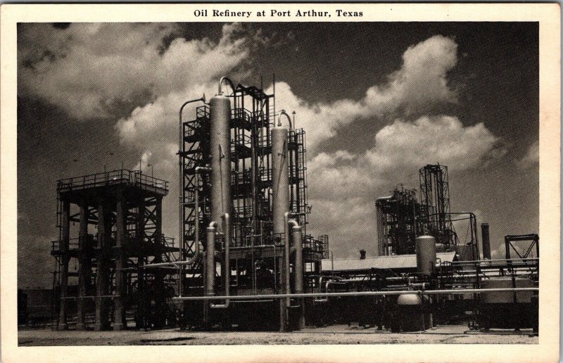 This vintage postcard from the 1940s depicts the oil refinery in Port Arthur, Texas. A fascinating piece of history, it showcases the industry's advancements during that time period. The postcard is a topographical collectible and a great addition to any collection. The year of manufacture is 1940.