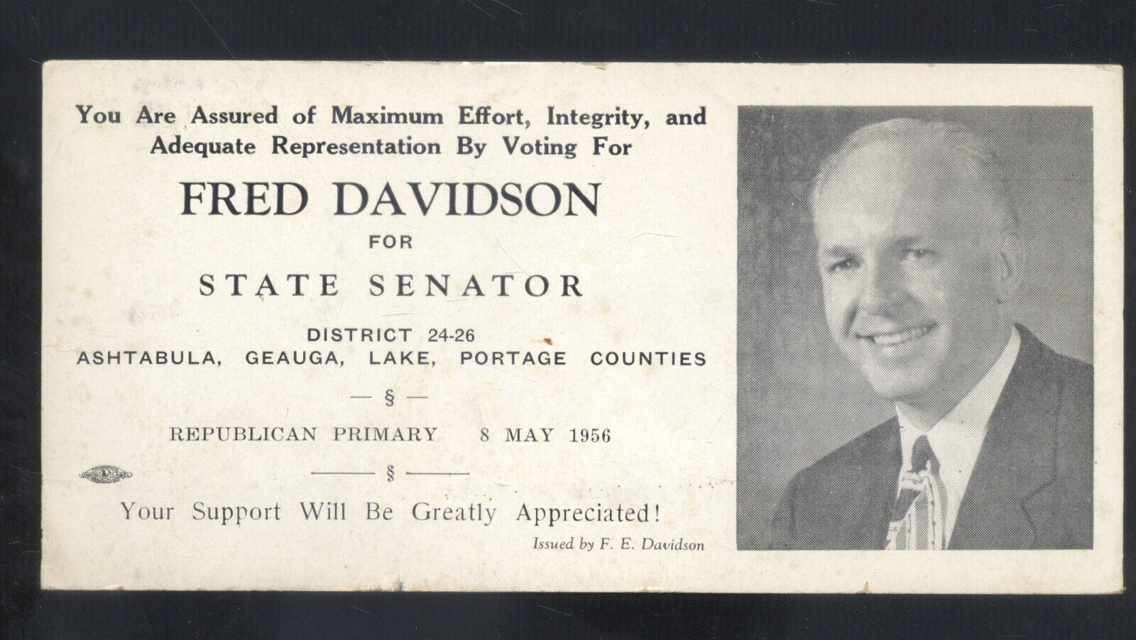 PORTAGE COUNTY OHIO FRED DAVIDSON FOR SENATE ASHTABULA ADVERTISING EPHEMERA