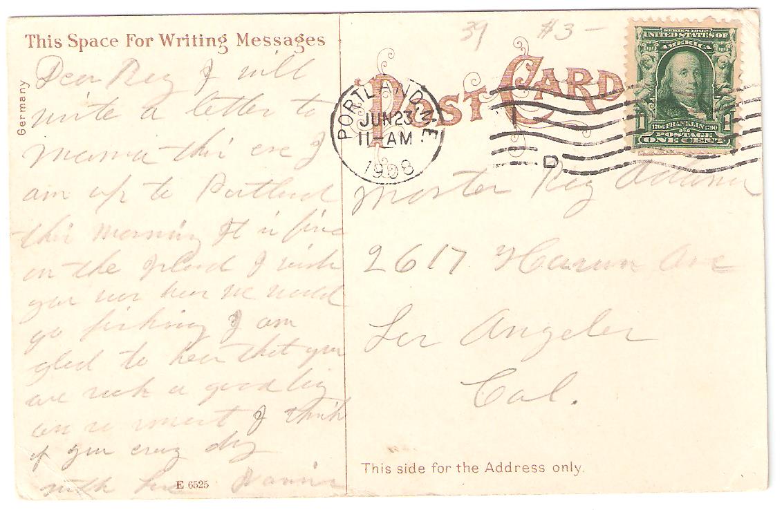 Nice post card mailed from Portland, Maine to Los Angeles, California on June 23, 1908. Nice post mark, and stamp # 300