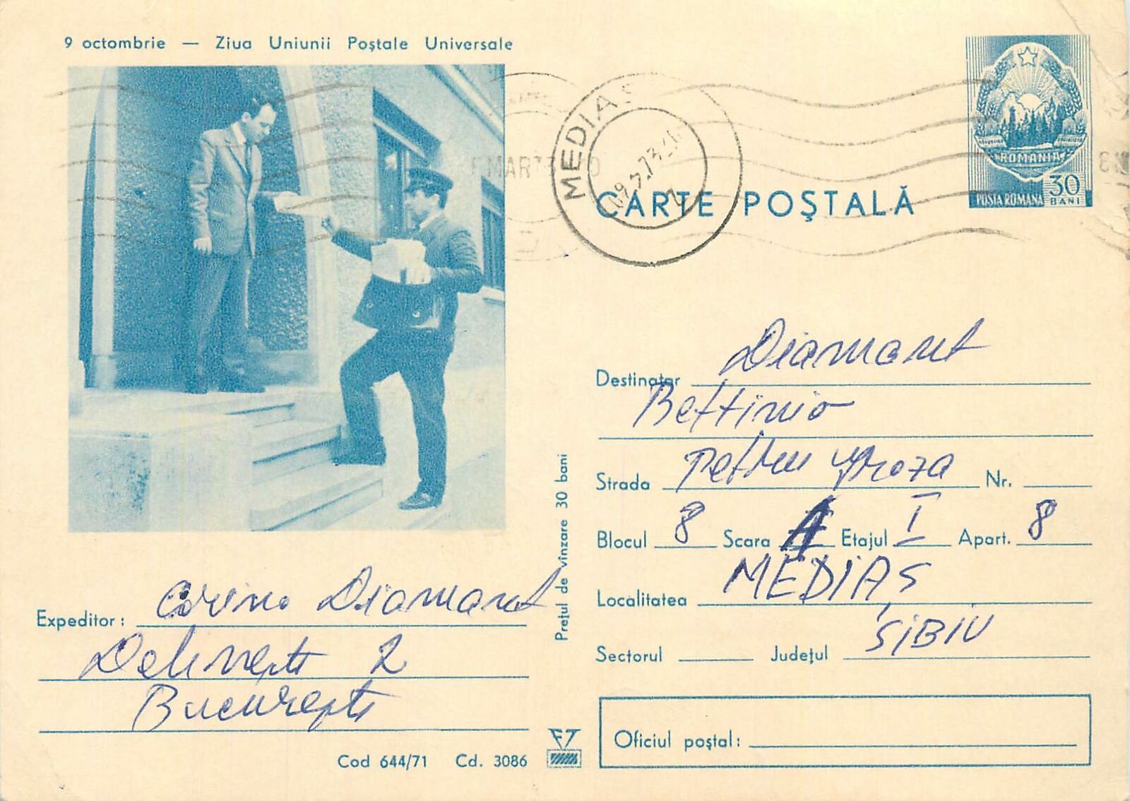 Post postman Romania postal stationery postcard 9 october Postal Union day
