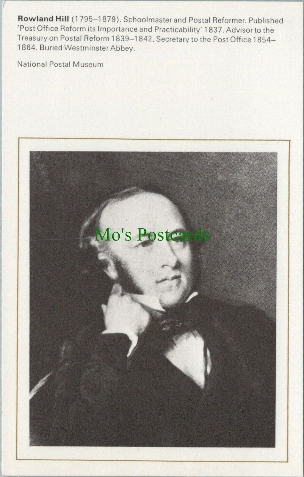 Mo's Postcards Postcard Description: Postal Museum Postcard - Rowland Hill Schoolmaster & Postal Reformer Genealogy Information: Defect(s): Postage & Payment: For U.K residents the quoted P & P fee is for any number ... Read More