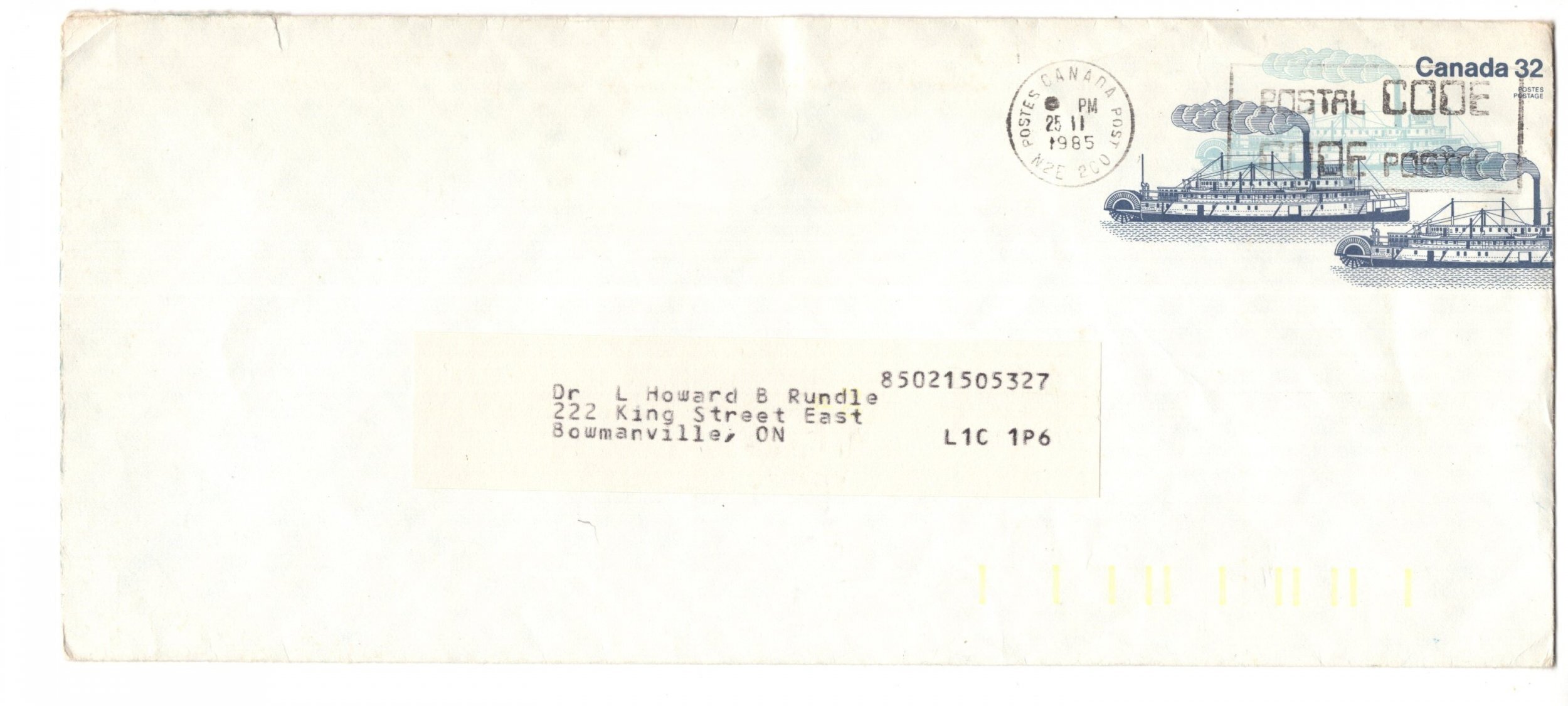 Postal Stationery Envelope, Canada, 32 Cent Ships, Used 1984