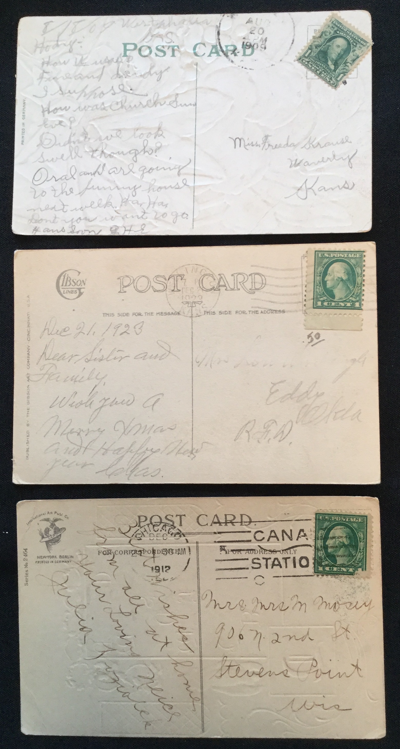 Postcard, (3) used. 1st card has corner crease. dated 1909,1912, 1923.Any shadows are due to my photographic expertise.See Photo for Condition.