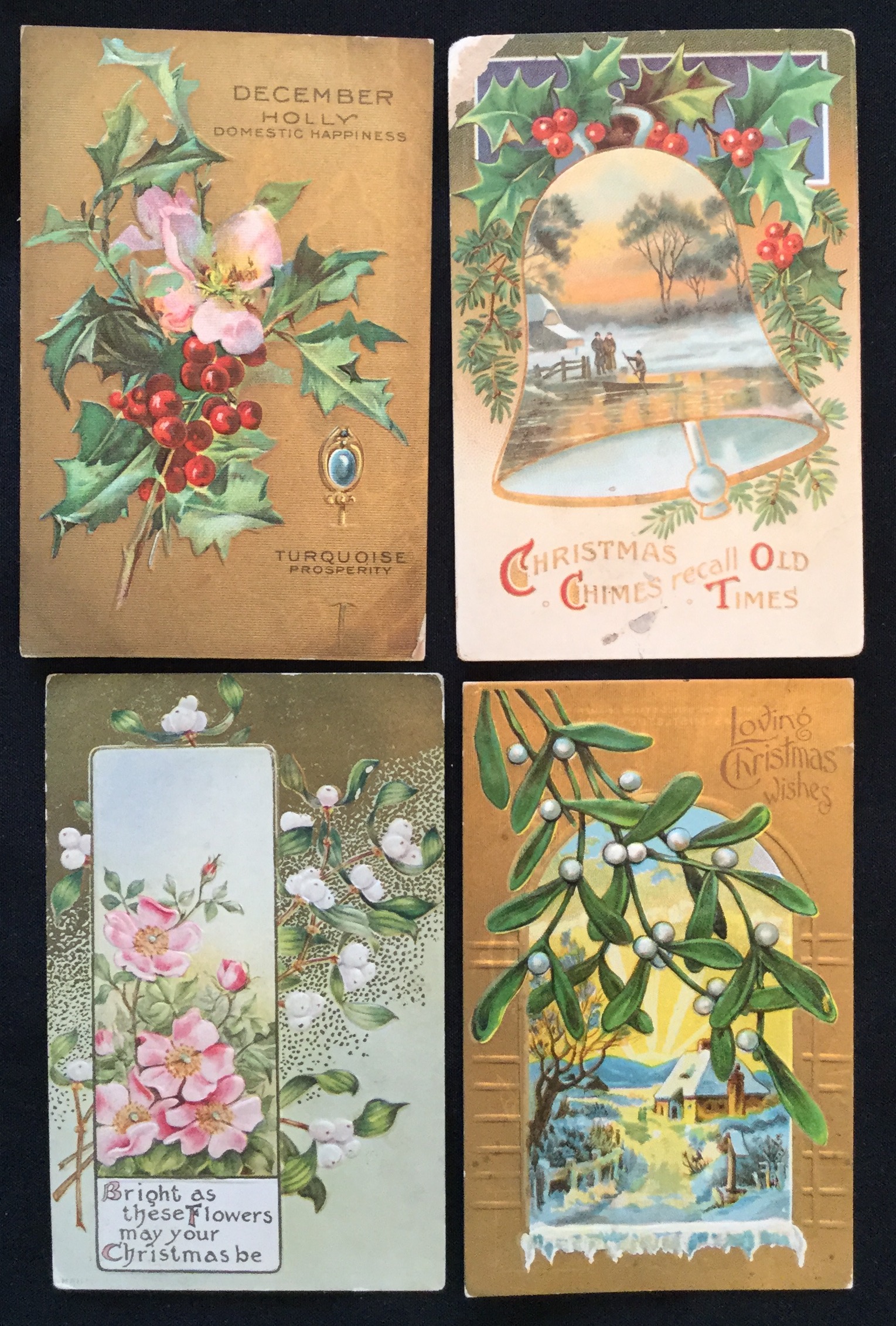 Unused postcards, (4). Holly/flowers-addressed but not mailed/mistletoe. any shadows are due to my photographic expertise.See Photo for Condition.