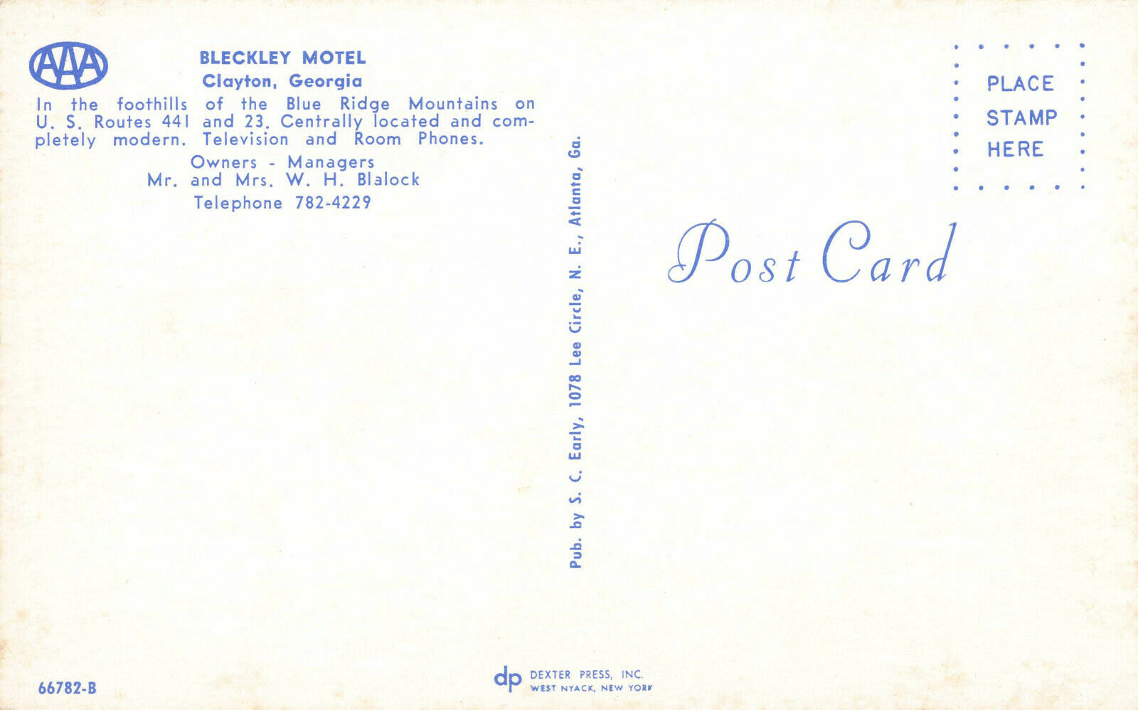 Postcard Bleckley Motel Clayton Georgia