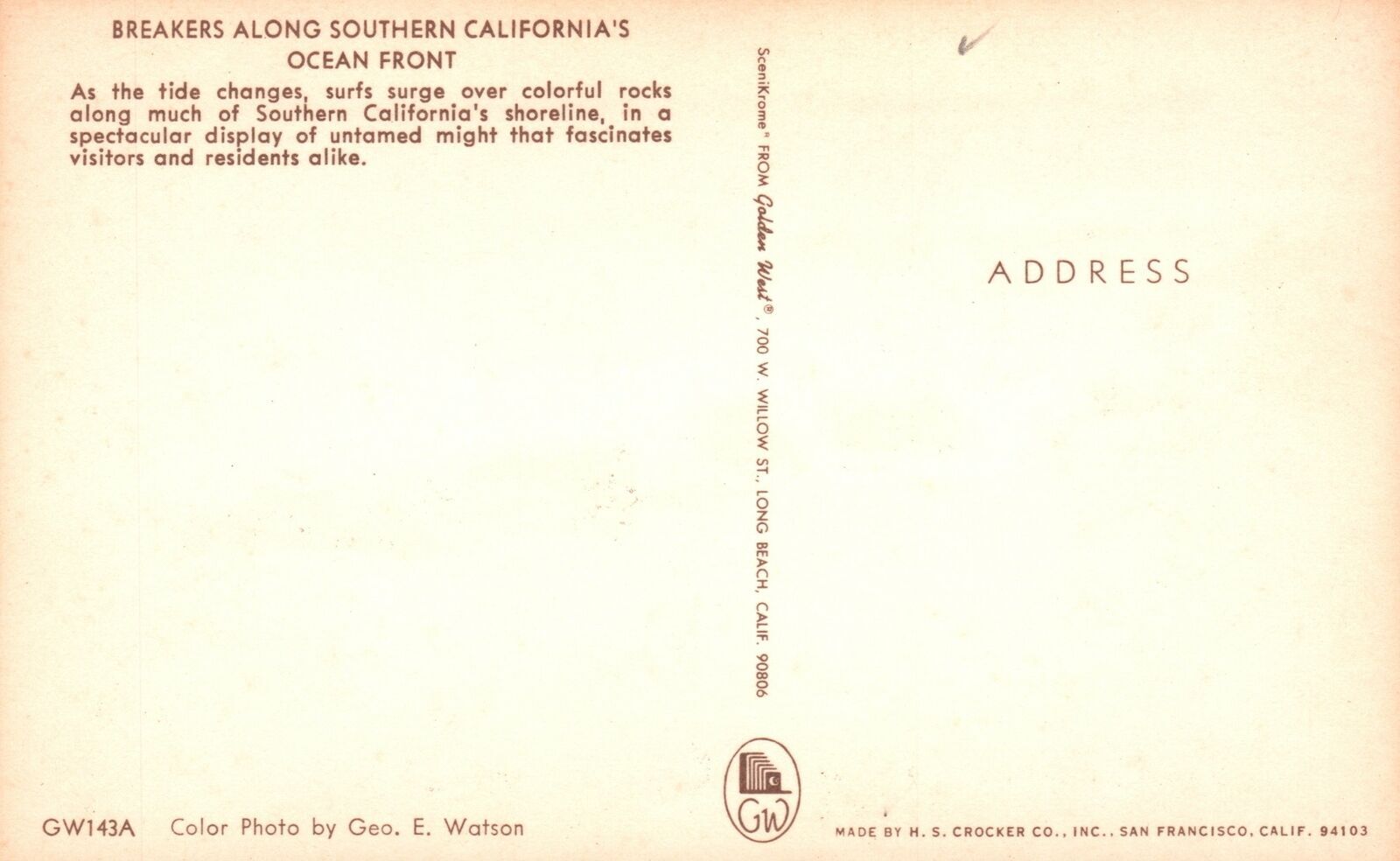 Condition: Used Postcard breakers along southern california ocean front surf surge tide changes Our large front and back scans show you the exact condition of this postcard. Terms of Service Communication: Lis ... Read More
