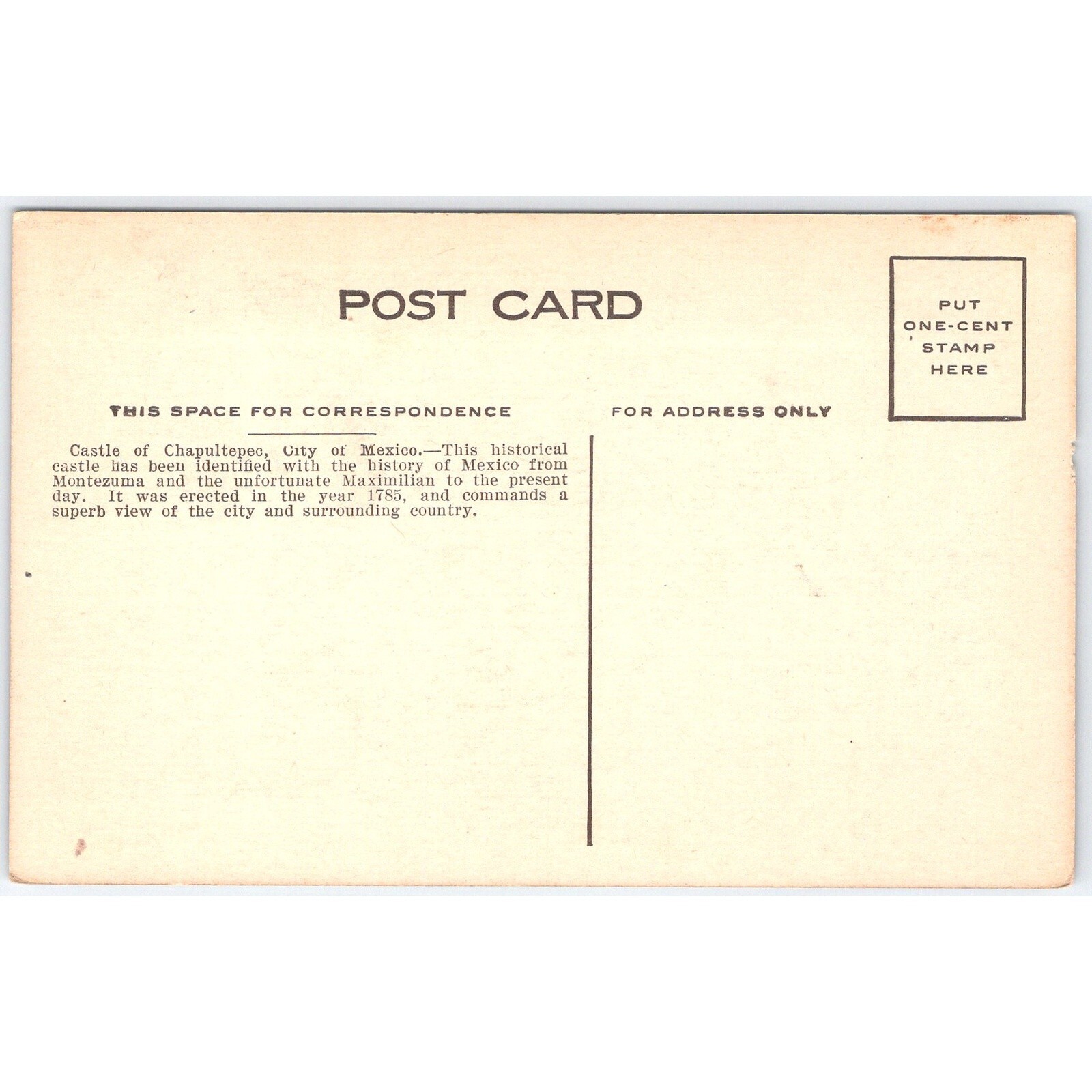 Postcard Castle of Chapultepec Mexico City Historical ViewYou will receive the exact postcard in the scans. This postcard features the Castle of Chapultepec in Mexico City. The historical castle is significant in the history of Mexico, associated with figures like Montezuma and Maximilian. Erected in 1785, it offers a superb view of the city and surrounding country.Please see my other items. I do combine shipping.