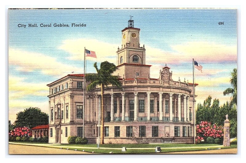 This vintage postcard features the City Hall of Coral Gables, Florida. It is a standard size printed lithograph made by Tichnor Brothers and is an original piece. The postcard is made of cardboard material and is unposted. The image on the postcard depicts the beautiful architecture of the City Hall building, which was constructed during the Linen era between 1930-1945. The postcard is a great addition to any collection of US states, cities, and towns. It comes as a single unit and is not part of a set. The postcard is in excellent condition and ready for display.
