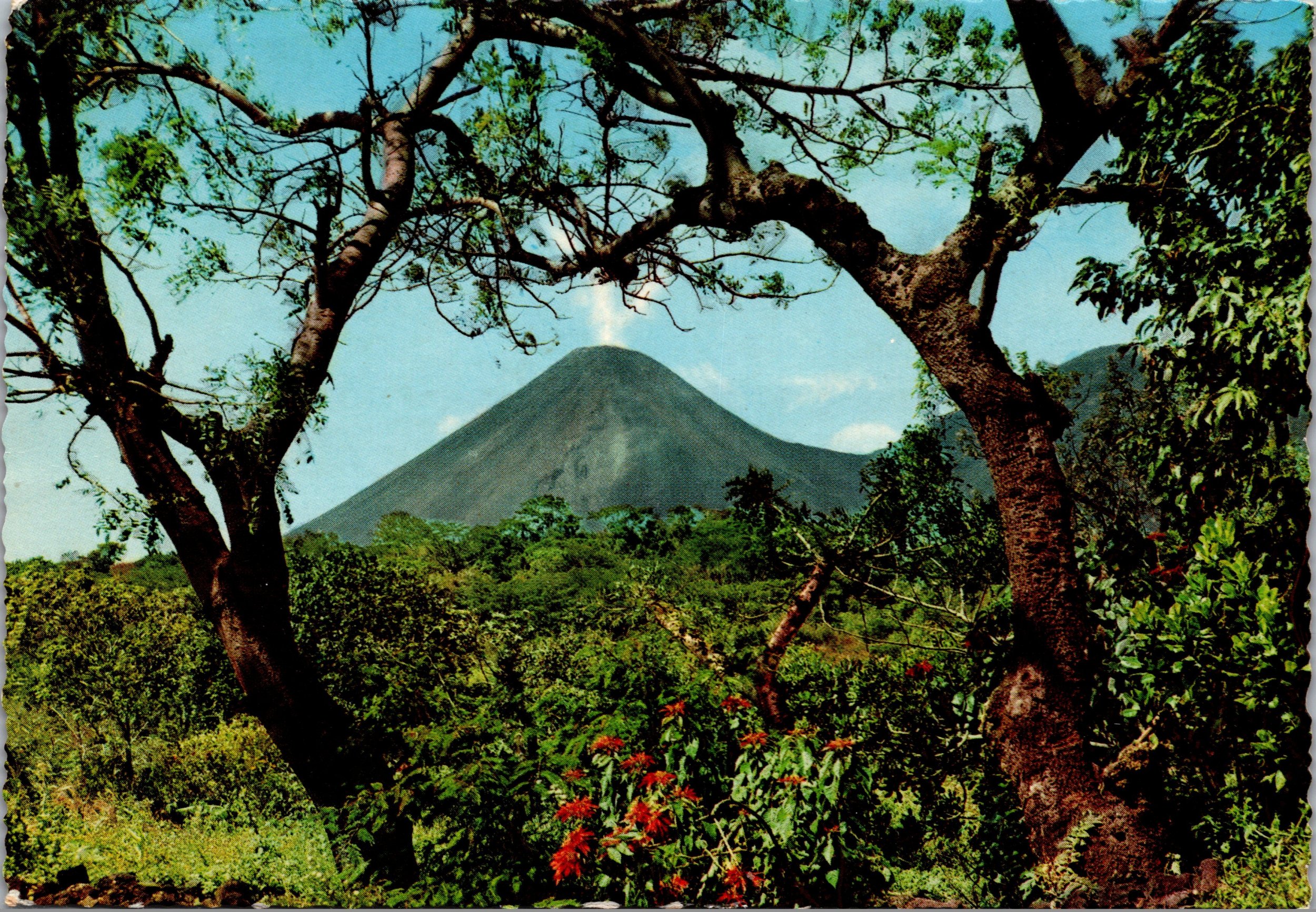 Postcard El Salvador Sonsonate Izaico volcano and poinsettia