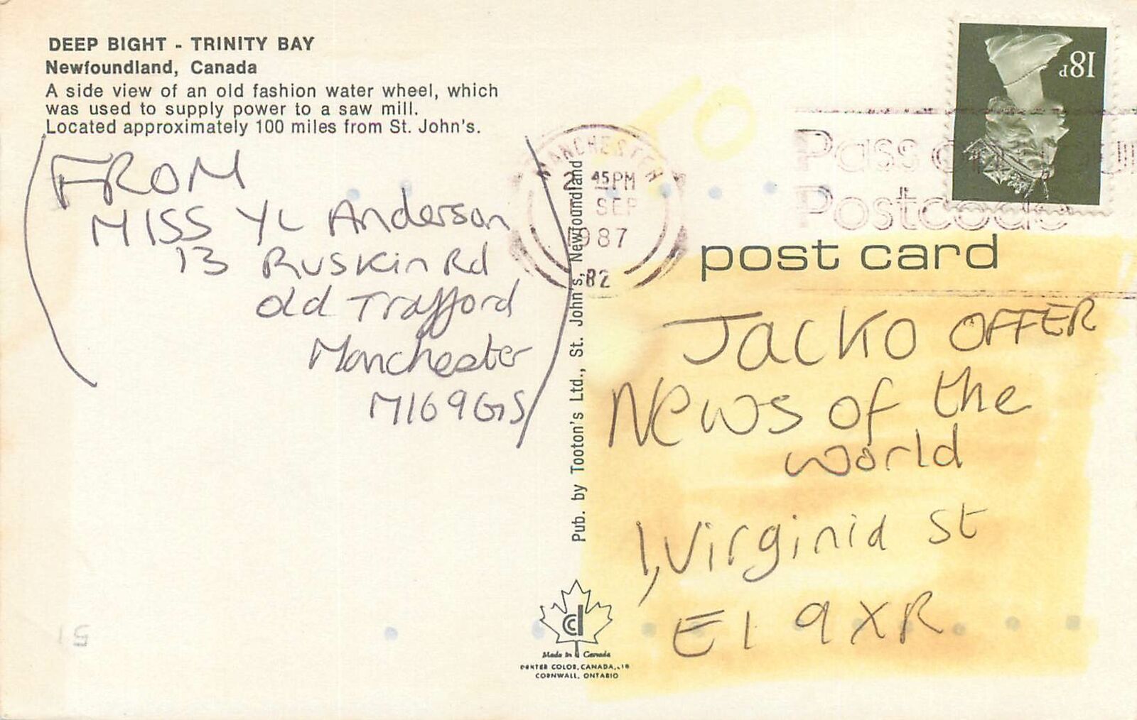Postcard England Canada Newfoundland water wheel Trinity Bay