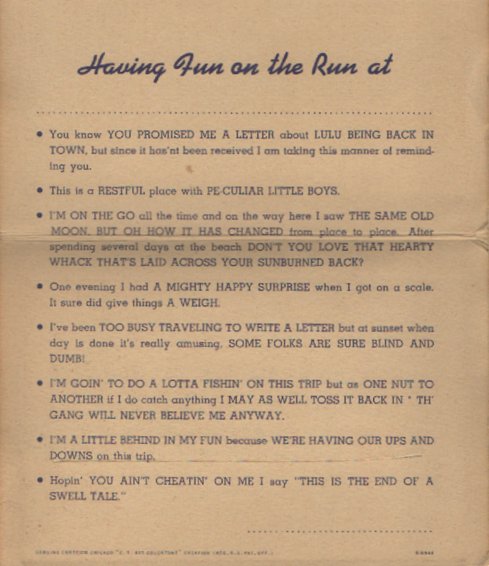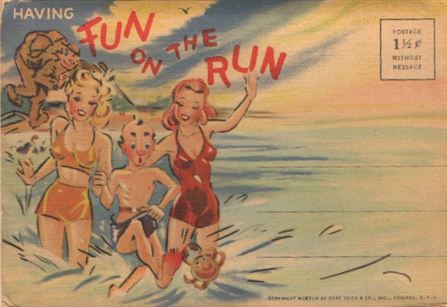 This was one way postcard companies employed to make use of the images in their library. Counting the images on the folder, you get 20 postcard gags, including three outhouse jokes, two fishing jokes, two butt jokes, one silhouetted nude, and a scattering of women in swimsuits or lingerie. Many of these are by Ray Walters, and two or three, including that Fun on the Run cover, are possibly new in this collection. One fun feature is the attempt, shown here, to write a sample postcard message, employing the titles of each postcard i the collection, a handy reference for which jokes you'll see (again)n here. Printed in 1942, never mailed or messaged and in excellent shapeOffers History