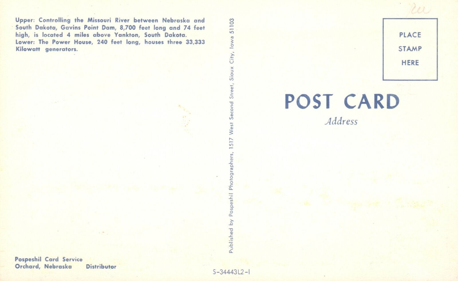 Postcard Greetings From Gavin's Point Dam Controlling Missouri River & Power Our large front and back scans show you the exact condition of this postcard.TERMS OF SERVICECommunication: