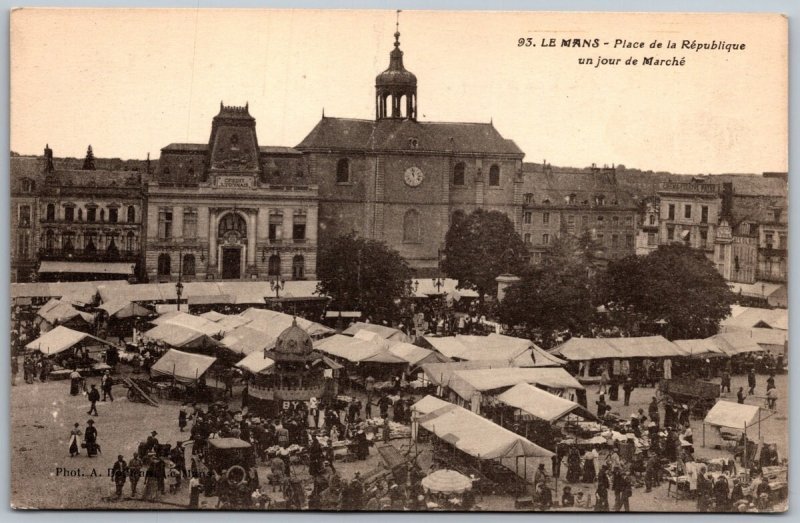 Postcard Le Mans France Market Day Plaza Clock Tower 1910s View