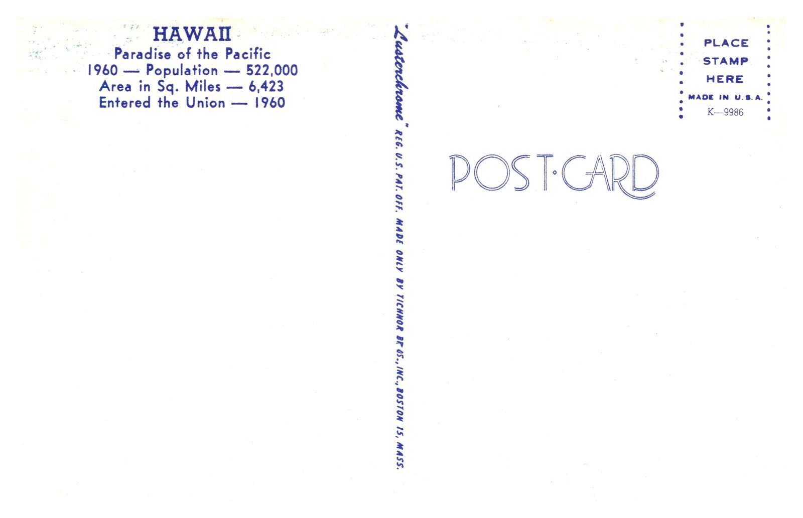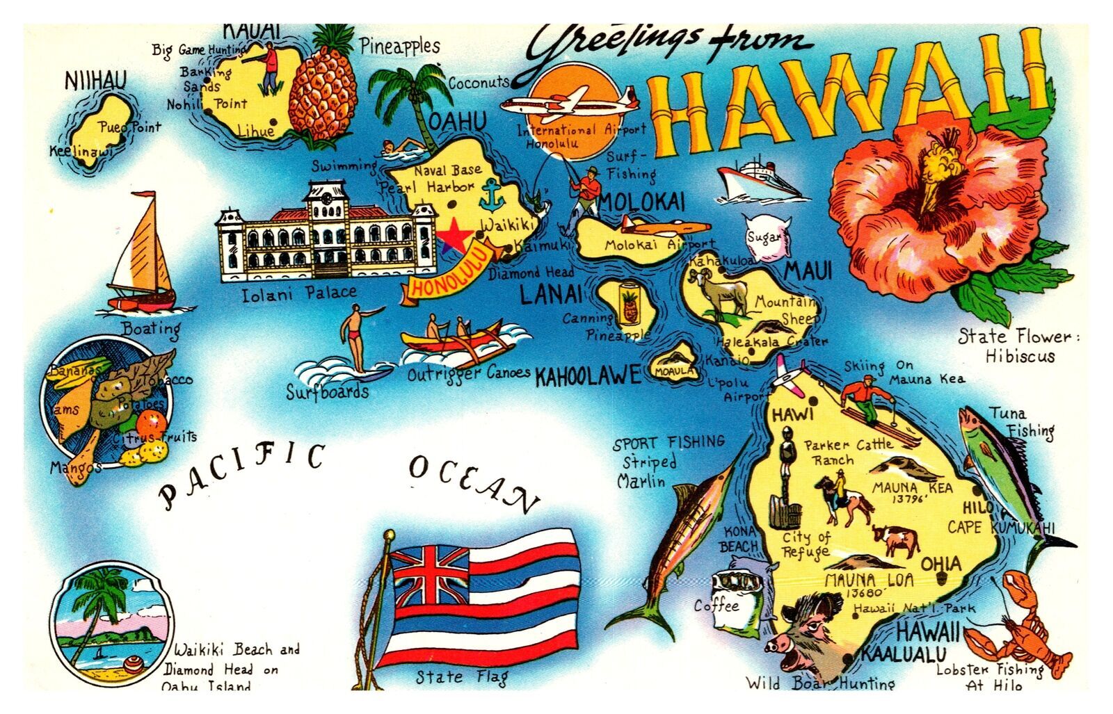 Postcard MAP Hawaii - Greetings from Hawaii - state flower flag