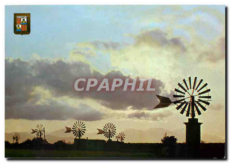 Postcard Modern Mills Mallorca at sunset