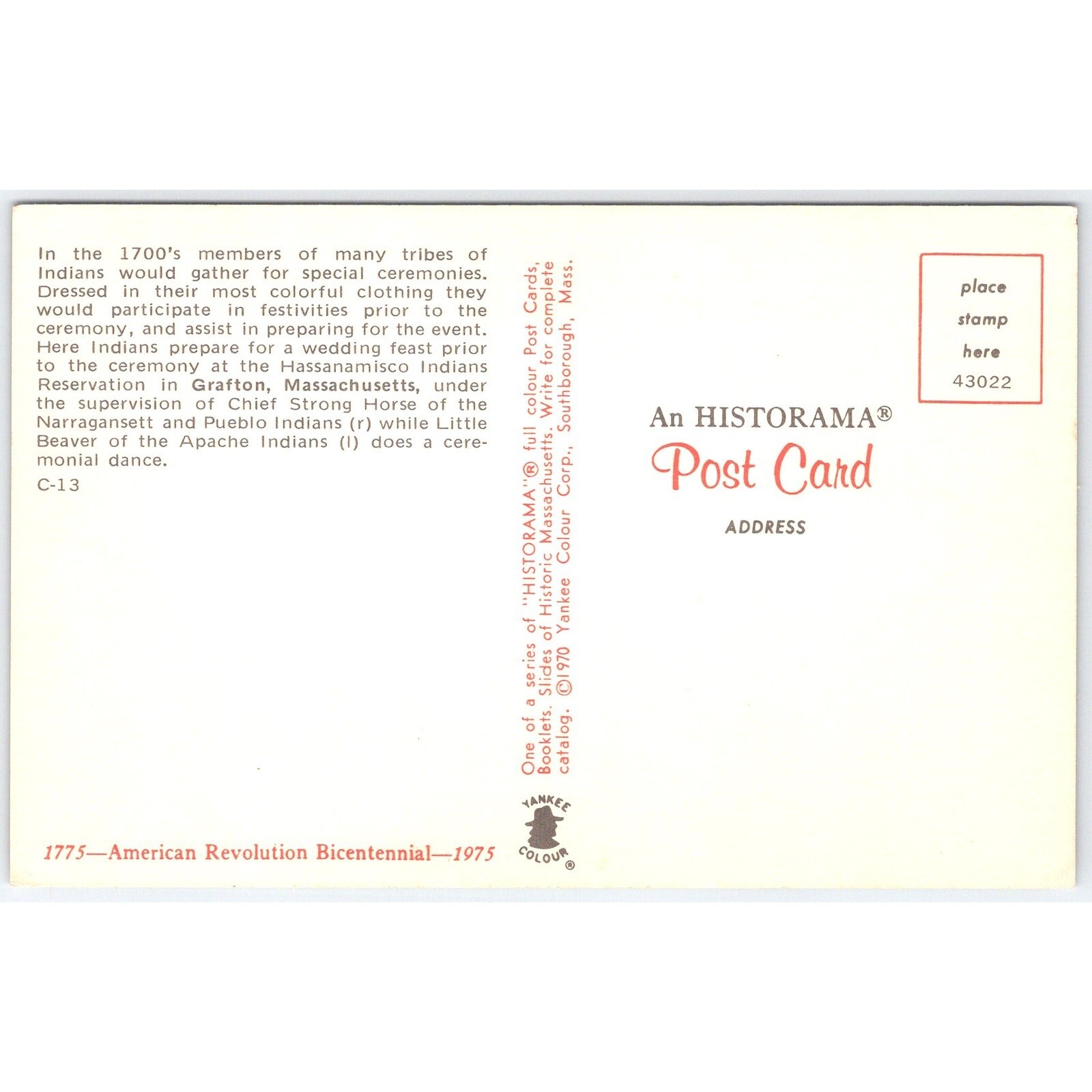 Postcard Native American Ceremony Grafton MA 1970sYou will receive the exact postcard in the scans. This postcard depicts a Native American ceremony at the Hassanamisco Indians Reservation in Grafton, Massachusetts. The image shows members of various tribes in colorful clothing preparing for a wedding feast under the supervision of Chief Strong Horse. Little Beaver of the Apache Indians performs a ceremonial dance. Published by Yankee Colour Corp. in 1970.Please see my other items. I do combine shipping.