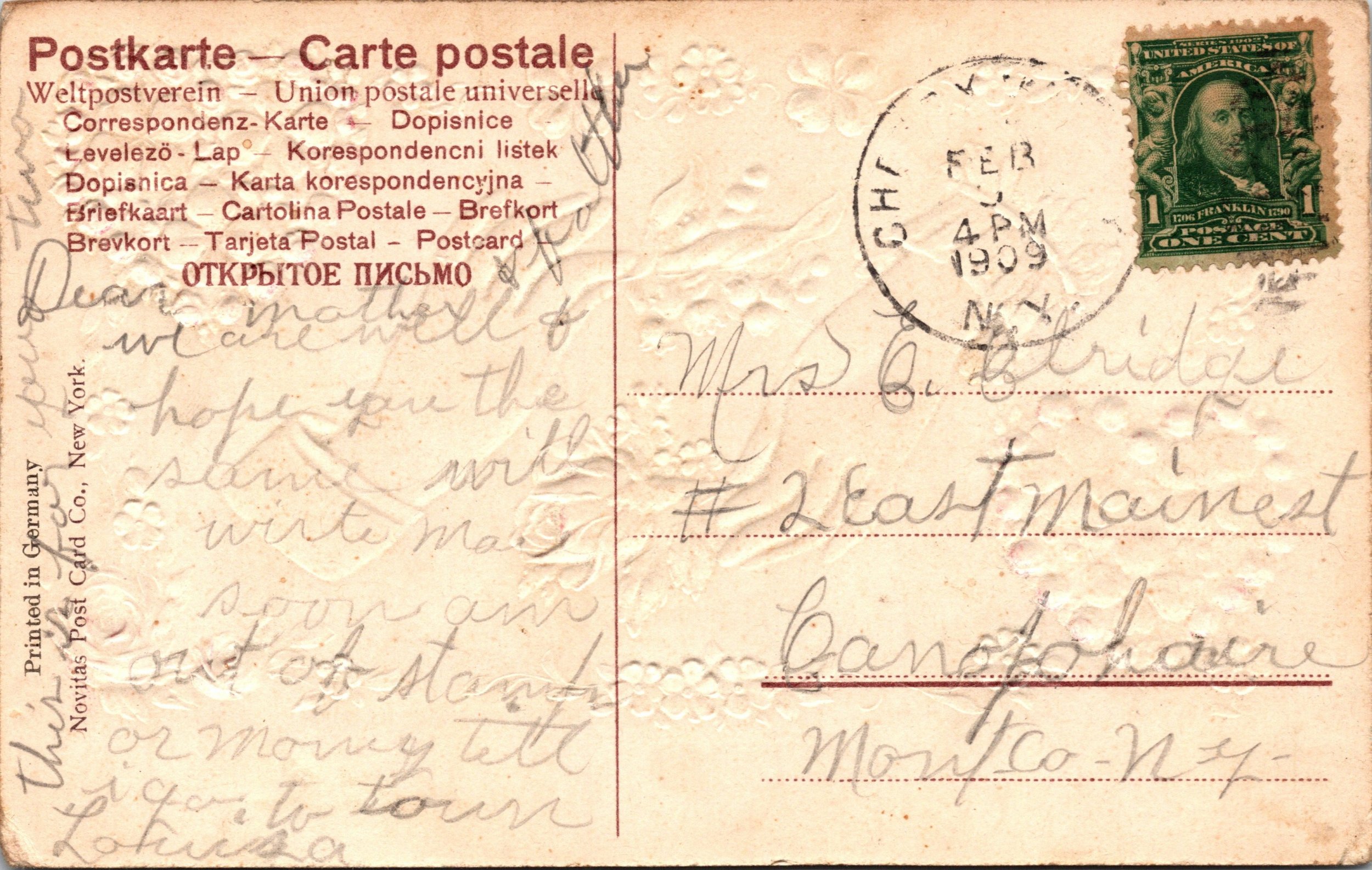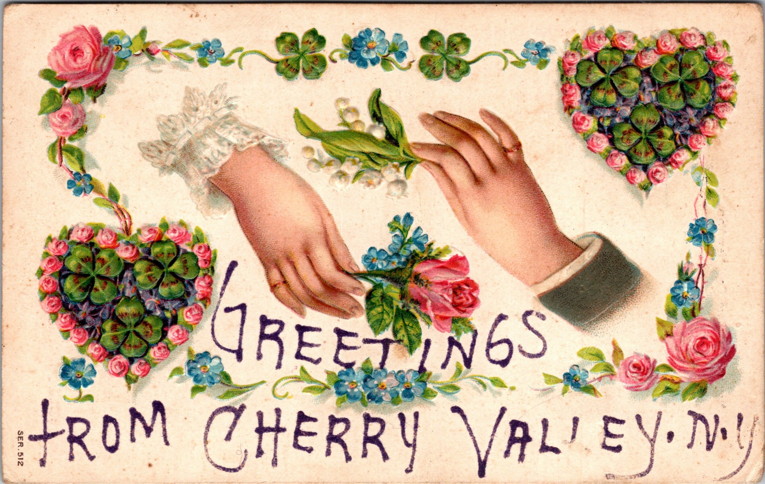 Early embossed postcard with joined hands, roses, lily of the valley and clover heart designs. Mailed in 1909 from Cherry Valley New York. A lovely example of ornate turn of the century artwork and a desirable Montgomery County town piece.