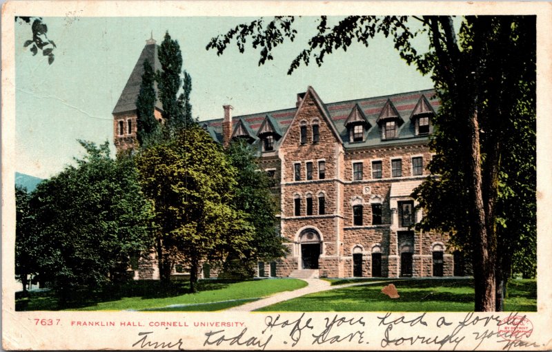 Original vintage postcard showing Franklin Hall at Cornell University in Ithaca New York. This early Detroit Publishing Co view captures the impressive stone architecture, dormer windows, and landscaped campus grounds Normal wear for an old postcard. Th