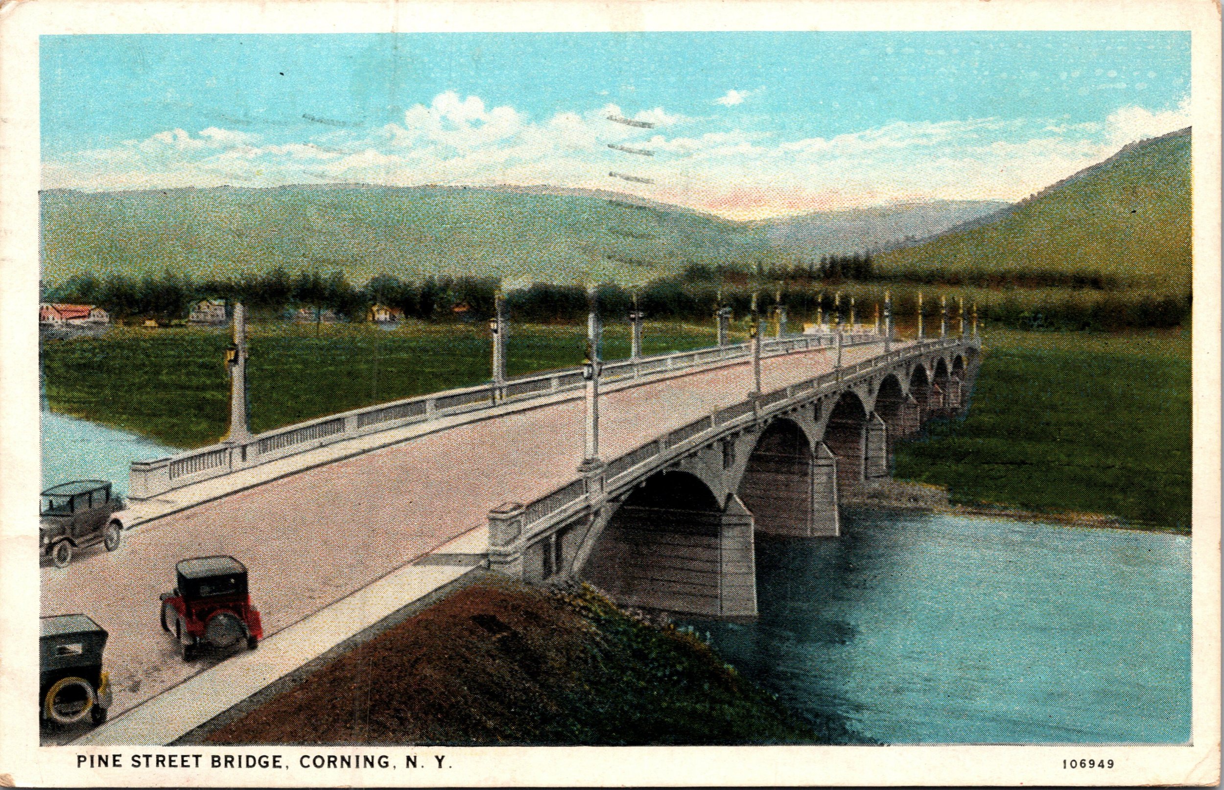 Original White Border era postcard published by Lambs Pharmacy showing the Pine Street Bridge in Corning New York. The long concrete arch bridge spans the Chemung River with early automobiles and scenic hills beyond ... Read More