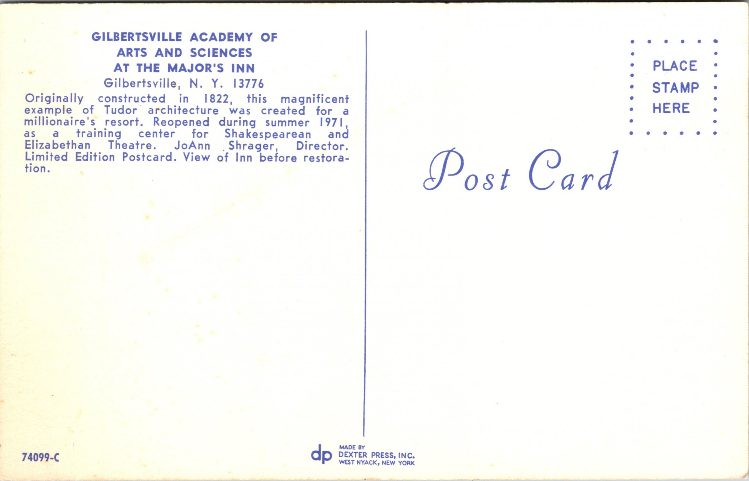 Postcard NY Gilberstvill Academy Major's Inn