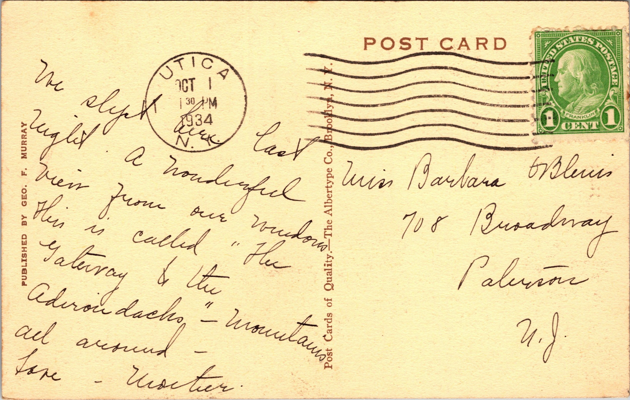Vintage sepia Albertype postcard of Hotel Utica in Utica New York. Published by Geo F Murray and printed by The Albertype Company. Postmarked October 1 1934 with one cent Franklin stamp. Shows toning and pencil mark ... Read More