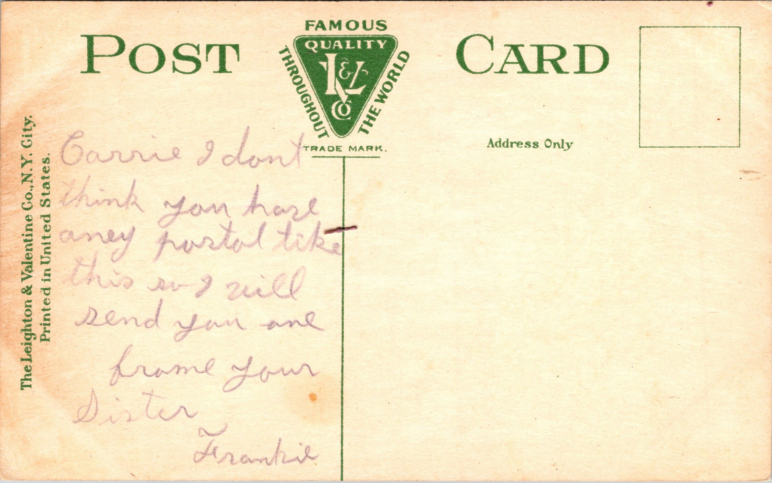 Normal wear for an old postcard. There may be creases, corner bumps, ink and postmarks on the front of the card, there may be writing on the back even if not postally sent. Please view the picture carefully. This is a Divided Back Standard size postca