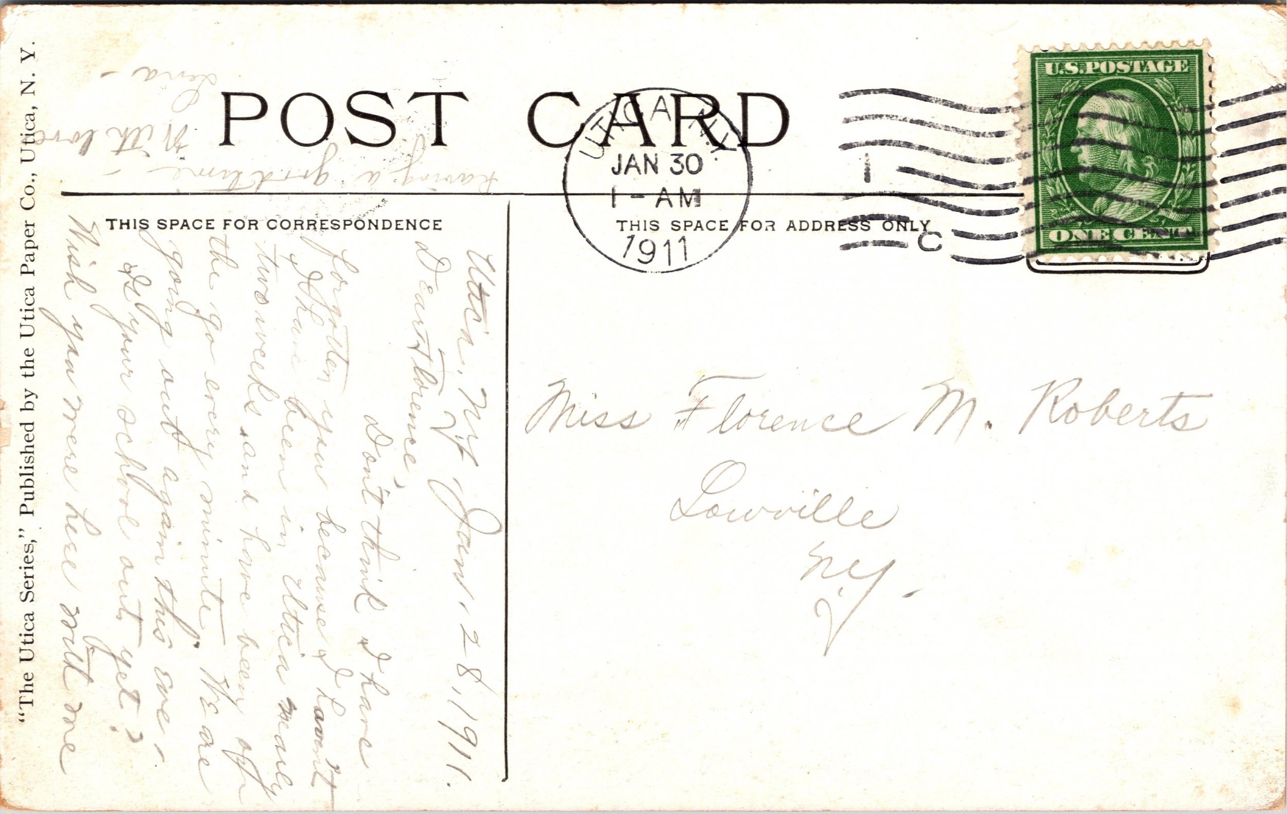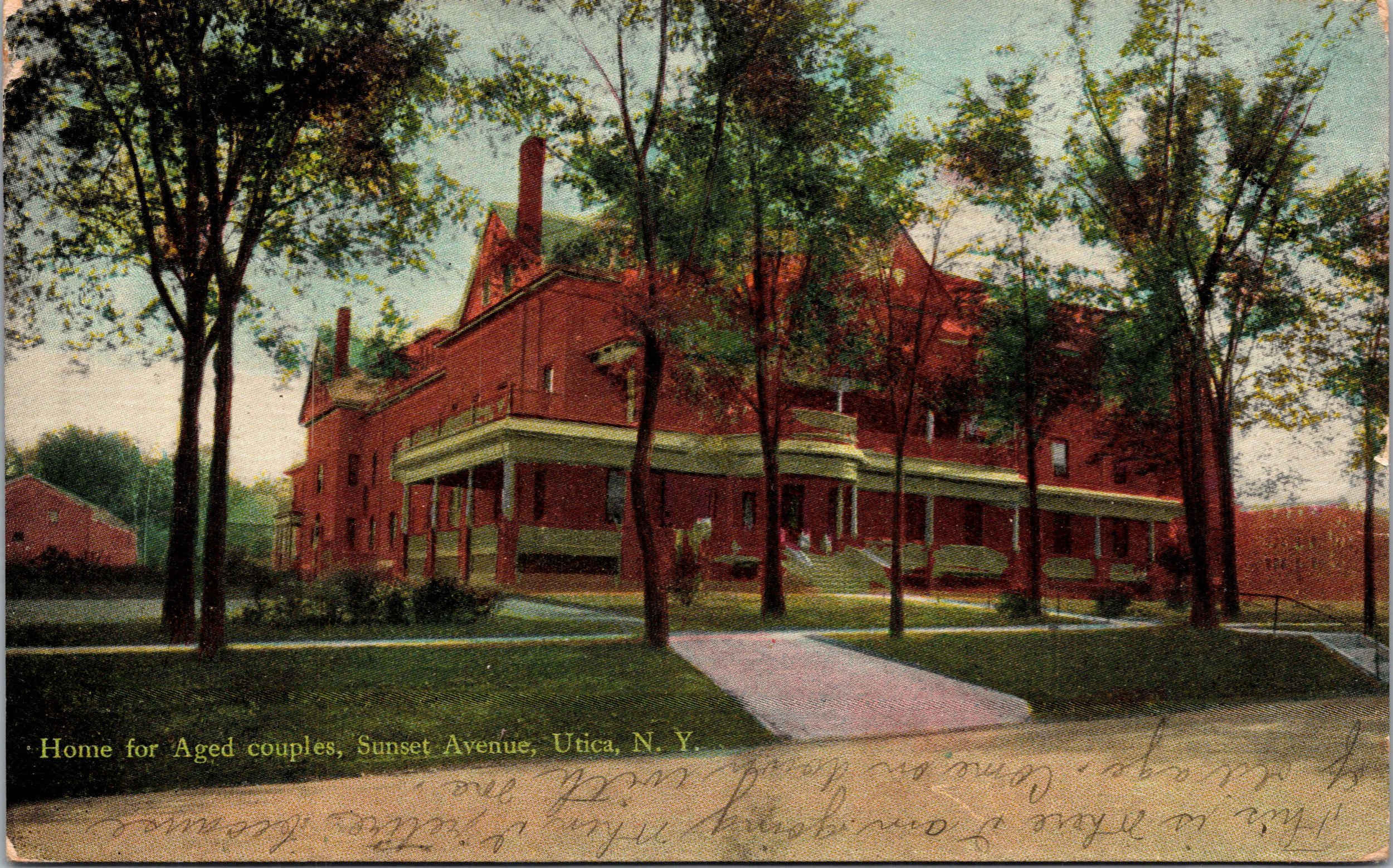 Vintage postcard of the Home for Aged Couples on Sunset Avenue in Utica New York. Published by the Utica Paper Co and postmarked January 30 1911. Strong architectural detail of the large brick residence and surrounding grounds.