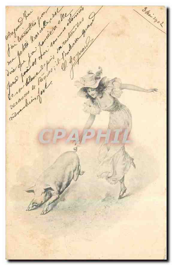 Postcard Old Woman Pig Pig