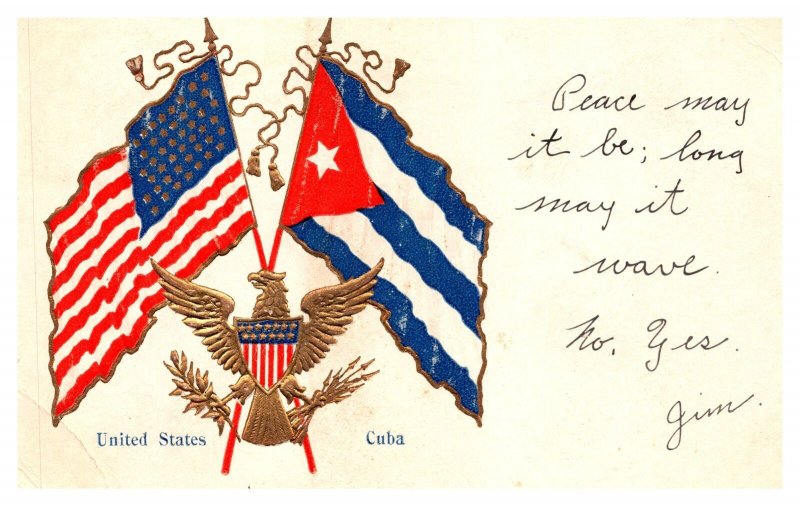 Postcard Patriotic United States Cuba flags Eagle Shield embossed